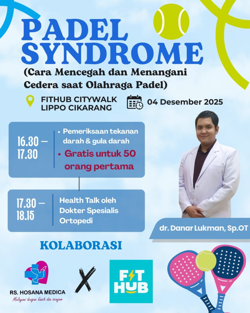 Datang dan hadiri event PADEL INJURY yang diadakan di Fithub Lippo Cikarang dan daparkan pemeriksaan tekanan darah dan gula darah gratis untuk 50 orang pertama