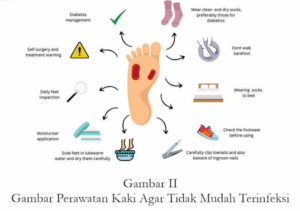 Pasien dengan kaki diabetes harus dapat merawat menjaga keadaan kaki agar tidak mudah terinfeksi yang mana dapat dilakukan dengan cara berikut: