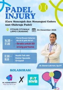 Datang dan hadiri event PADEL INJURY yang diadakan di Fithub Lippo Cikarang dan daparkan pemeriksaan tekanan darah dan gula darah gratis untuk 50 orang pertama